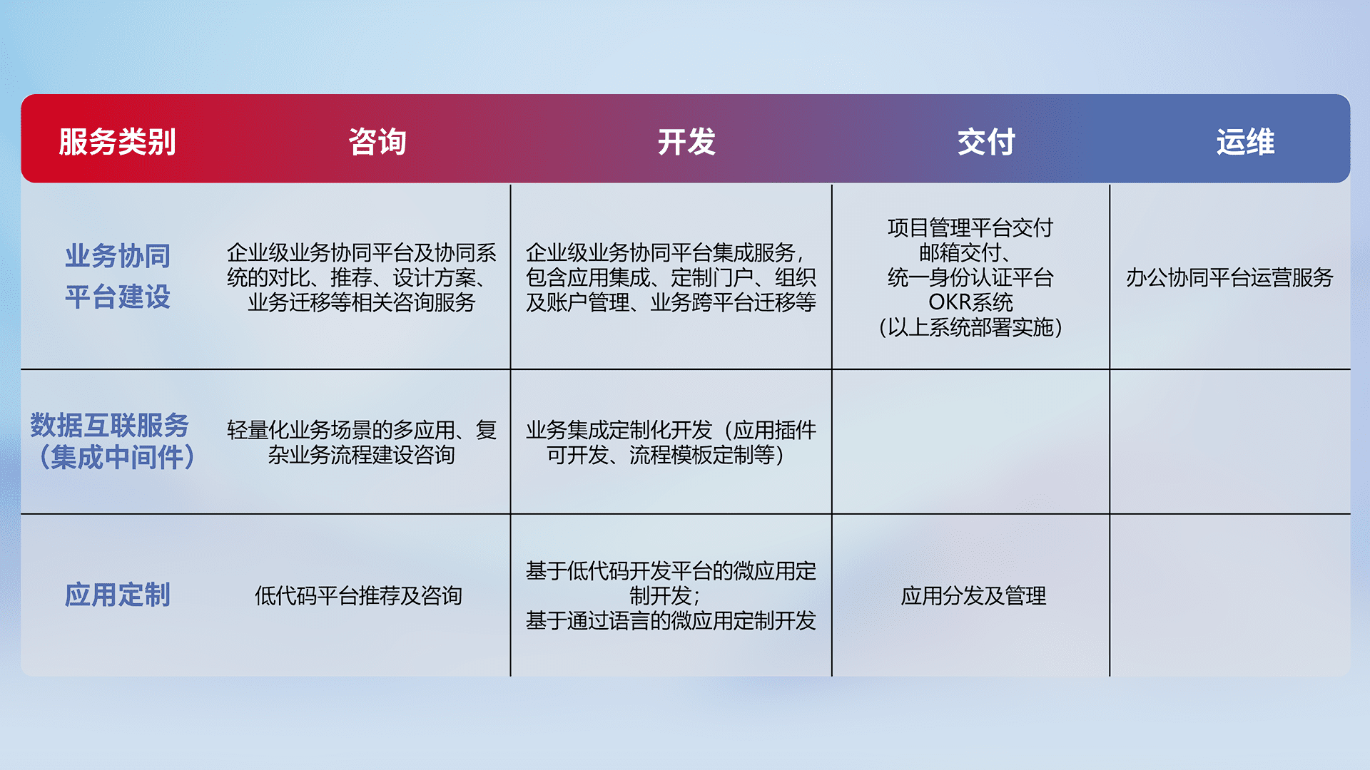 针对钉钉、、、、企微、、IDaas等平台级产品提供产品的规划、、、、方案、、、交付、、、、定制化开发等服务,,,实现如统一协同办公、、、、智能客户服务、、混合会议管理、、智能数据查询、、等业务场景,,实现数字化转型。。