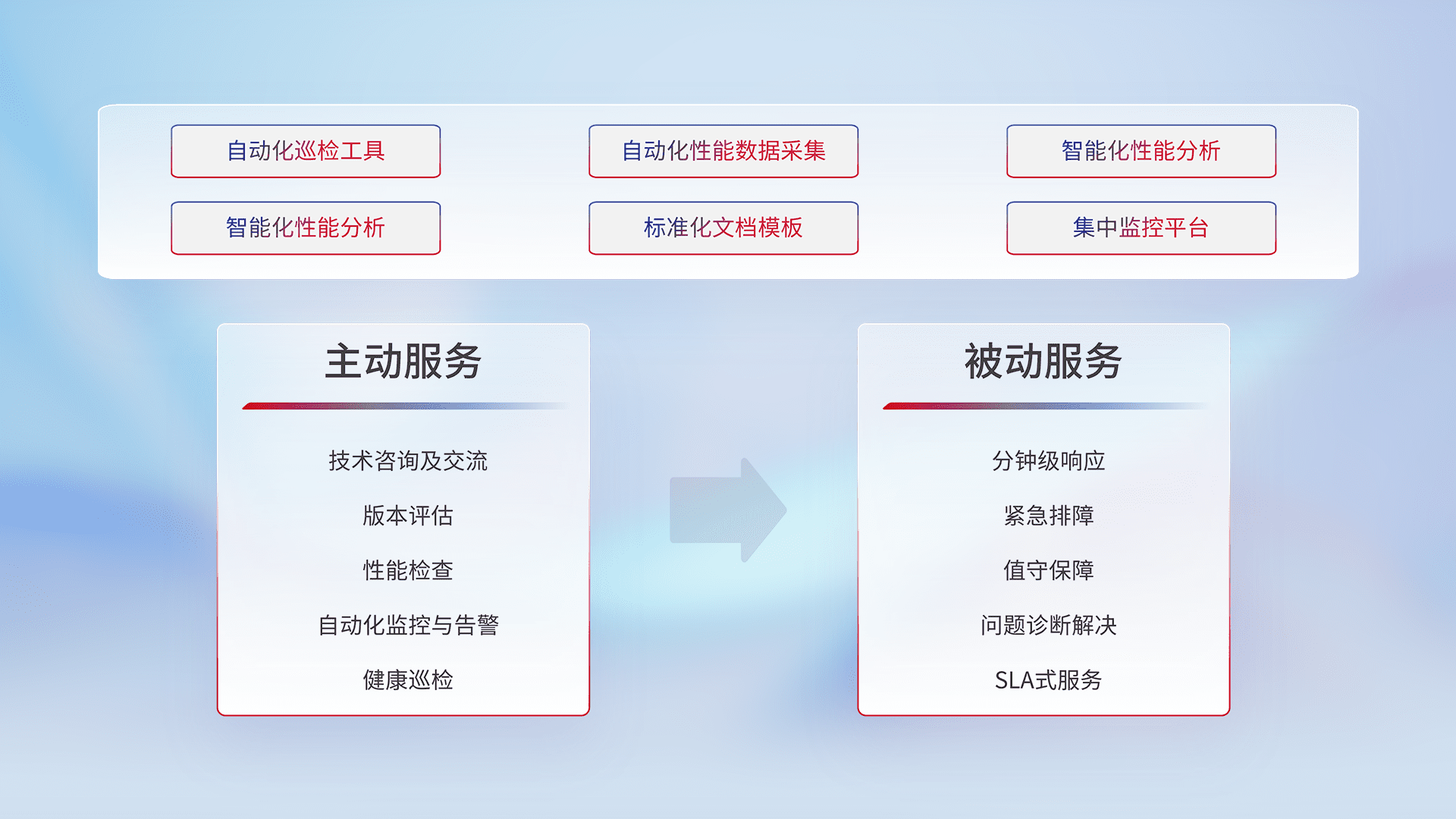 智能化工具和标准化文档,,,,保障服务质量,,,,提供主动服务(包含技术咨询、、、、版本评估、、性能检查、、、自动化监控与告警、、、、健康巡检)和被动服务包含(分钟级响应、、、紧急排障、、值守保障、、问题诊断解决、、SLA服务)。。。